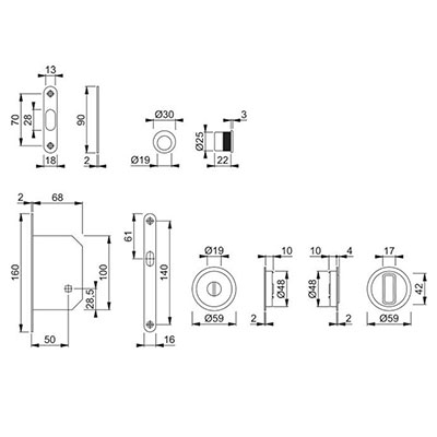 Kit poignée cuvette ronde alu pour porte coulissante avec verrou de condamnation